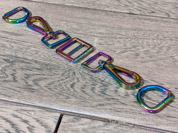 This rainbow hardware kit includes everything pictured; 2x 1″ D-rings, 2x 1″ swivel hook, and 1x 1″ tri-glide slider. Everything you need for a 1″ crossbody strap.